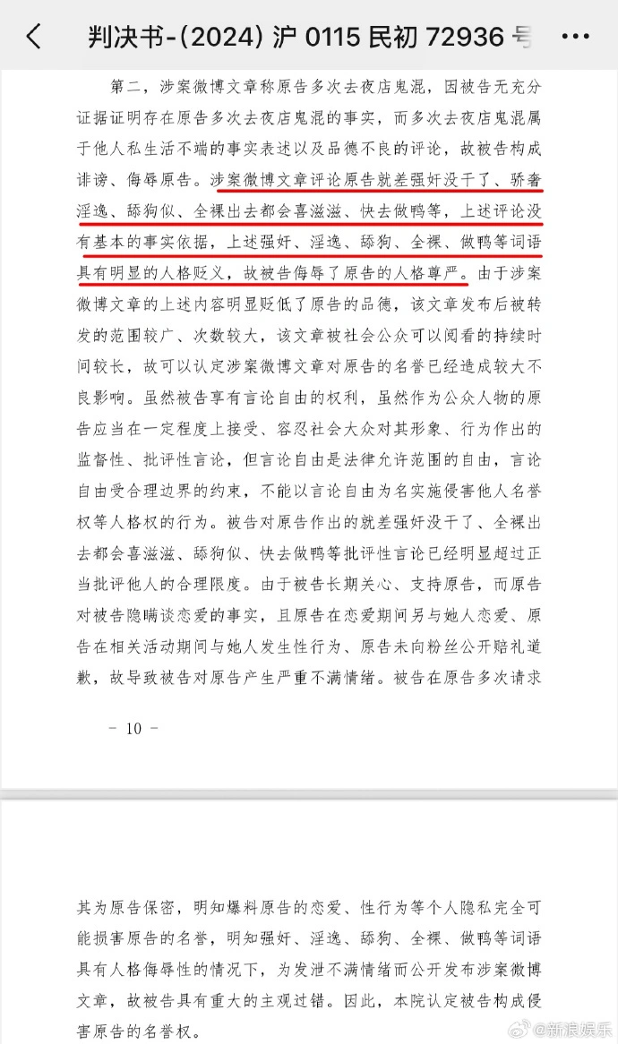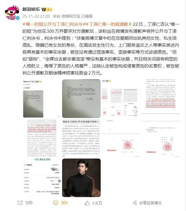 “年度最反转吃瓜现场!” 11月22日,“唯一的姐” 郝女士公开与丁泽仁的法院判决书,直接给这场拉扯3年的闹剧盖棺定论——法院明确认定 “出轨其他女性、私生活混乱” 等核心爆料 “具有基本事实依据”,而郝女士被判公开道歉、赔偿5.1万元,仅因使用 “舔狗”“做鸭” 等侮辱性词汇。网友对此给出了自己的锐评:“翻译一下:说的都是真的,但骂人不行!”