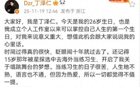 2025年11月19日:丁泽仁26岁生日当天发长文翻案,否认 “被包养300万”,坚称自己 “感情专一、无道德败坏行为”,要求郝女士道歉。