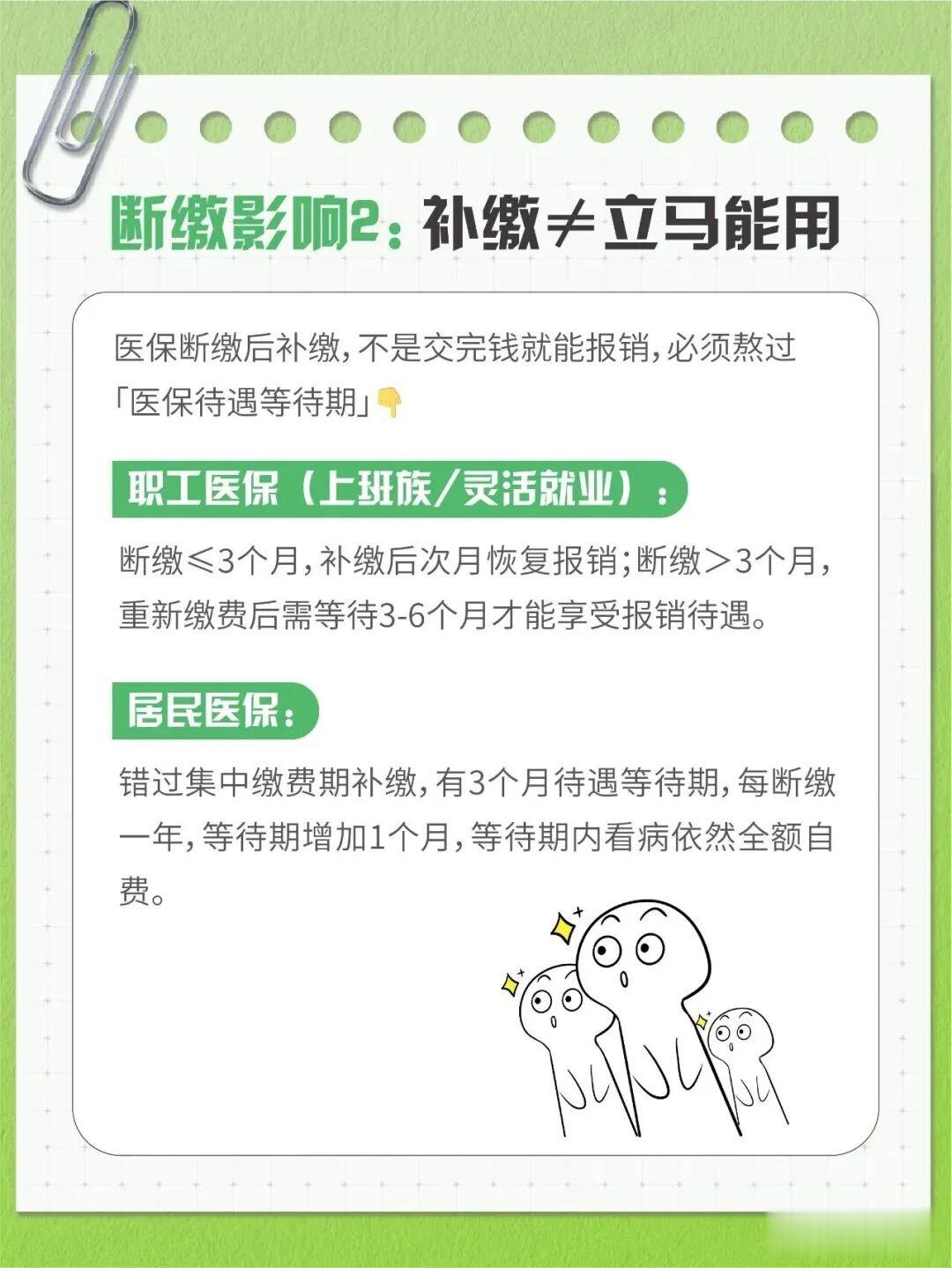 换工作、裸辞时随手就把医保停了?觉得每年的居民医保费用贵,等生病再交也不迟? 很多人觉得 “医保断缴没大事,补上就好”,其实这种想法大错特错!医保断缴不仅会让你陷入 “看病全自费” 的困境,还会影响终身医保、生育待遇等多项福利。 不管是职工医保还是居民医保,医保断缴的后果比你想象得严重得多!今天一篇讲清:医保断缴会怎么样,大家一定要存好! ⚠️医保断缴影响 1:图2⚠️医保断缴影响 2:图3⚠️医保断缴影响 3:图4⚠️医保断缴影响 4:图5职工医保断缴后如何补救? 1. 及时补缴(3 个月内):医保断缴3 个月内补缴,补缴期间发生的医疗费用可按规定追溯报销,且不设待遇等待期。 2. 灵活就业参保:离职后若暂时未找到工作,可转为灵活就业人员身份继续缴纳医保,确保医保待遇不中断。 3. 转为居民医保:若无法承担职工医保费用,可转为参加城乡居民医保,虽然报销比例较低,但能提供基础医疗保障。 最后再强调一句:医保是普通人看病就医的最后一道防线,别因为一时疏忽医保断缴,最后用几千、几万的费用买单。 收藏这篇笔记,转给身边的朋友,一起守住这份健康保障❤️#医保断缴后怎么办#医保断缴影响生活#医保知识科普