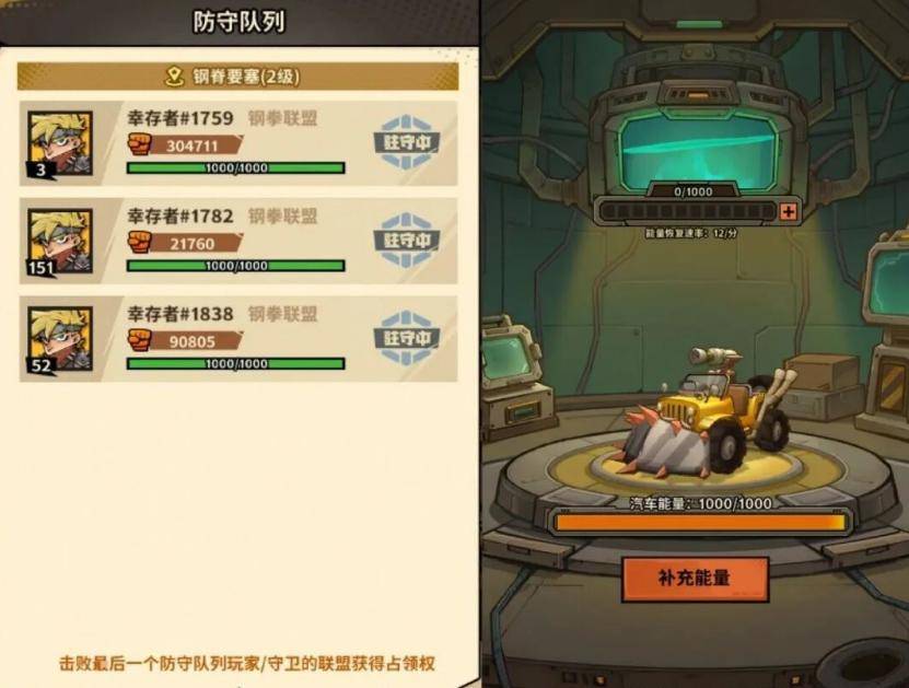 核心作用:幸存者依赖载具能量生存、进攻,能量耗尽需返回车库补充,才能继续战斗