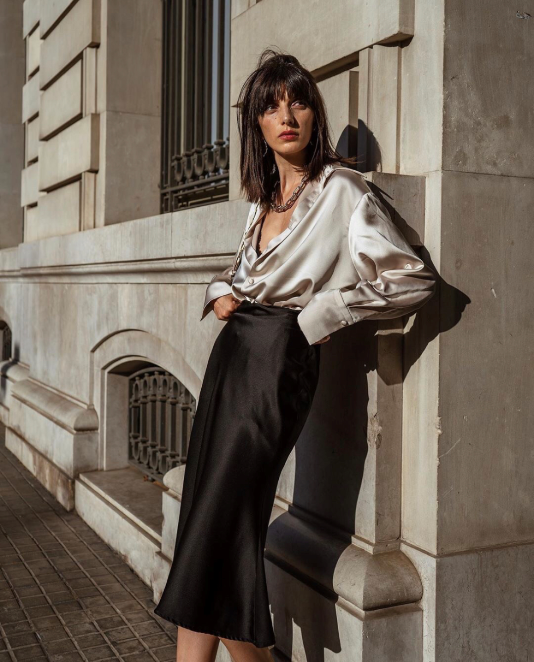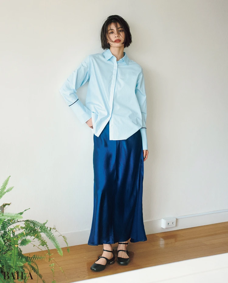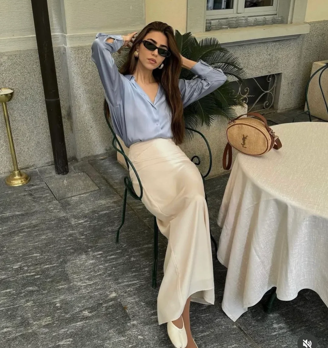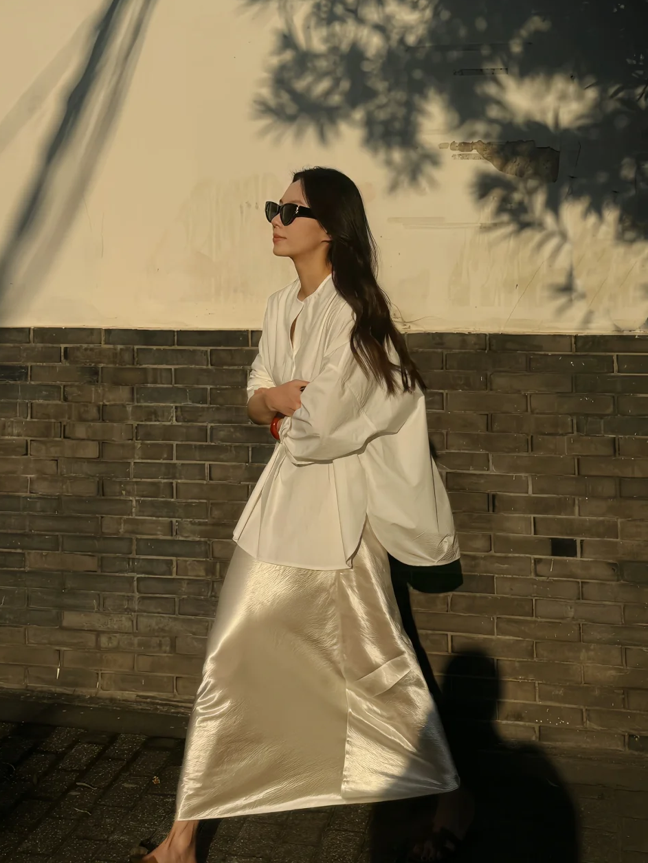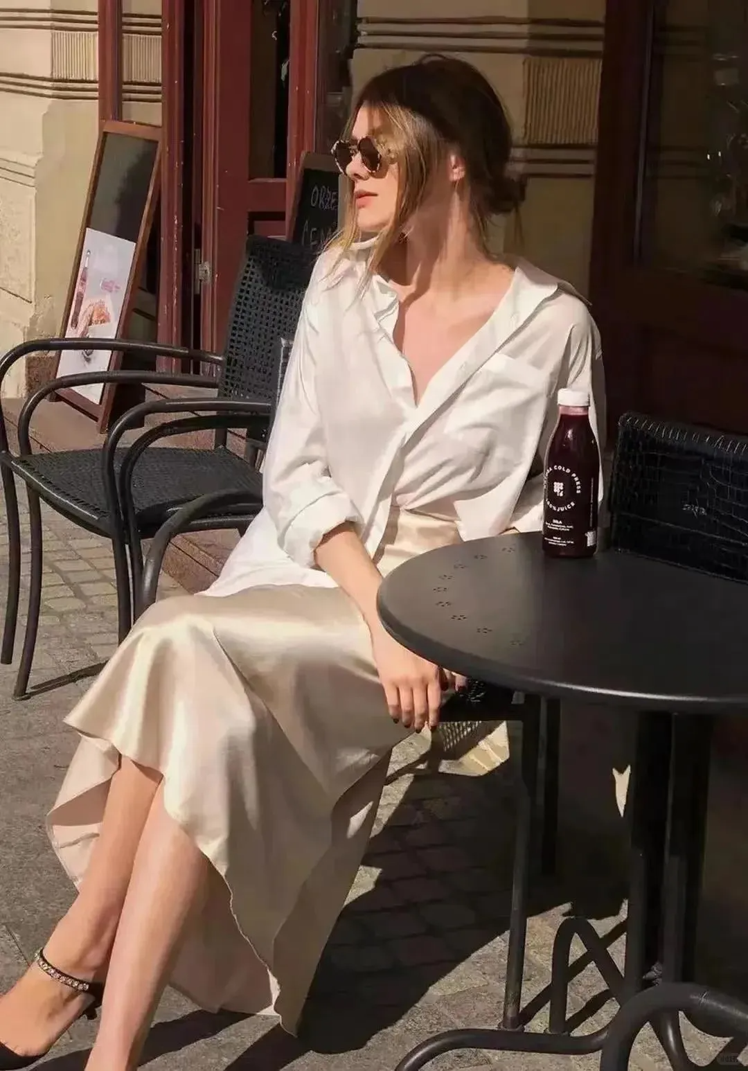 “衬衫 + 缎面直筒裙” 都能轻松 hold 住,