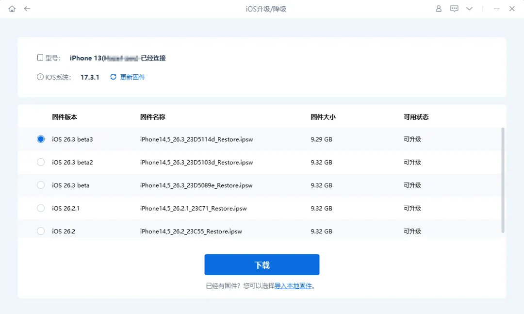 步骤3:选择需要升级的固件版本后,点击【下载】等待开始下载iOS固件
