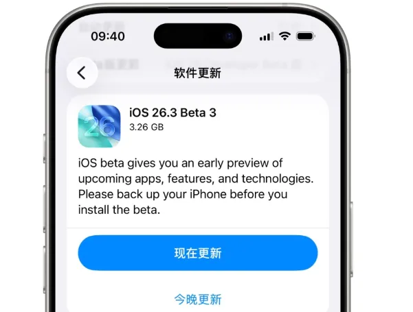 苹果于 2026 年 1 月 27日向注册开发者推送 iOS/iPadOS 26.3 开发者预览版 Beta 3,内部版本号均为 23D5114d,距上一测试版约 14 天。