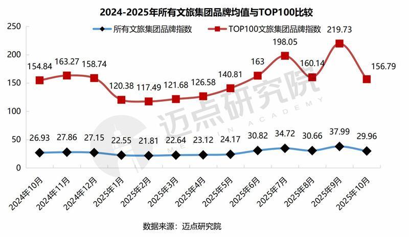 经迈点研究院监测数据显示,2025年10月,所有文旅集团的品牌指数值为29.96,同比上升11.25%,环比下降21.14%;TOP100文旅集团品牌指数值为156.79,同比增长1.26%,环比下降28.64%。伴随文旅复苏进程的加快,2025年10月文旅集团的品牌指数同比整体呈增长态势;品牌指数环比下降则主要因国庆中秋假期结束后,文旅市场需求显著下滑,各集团的品牌宣推工作进入平缓期。