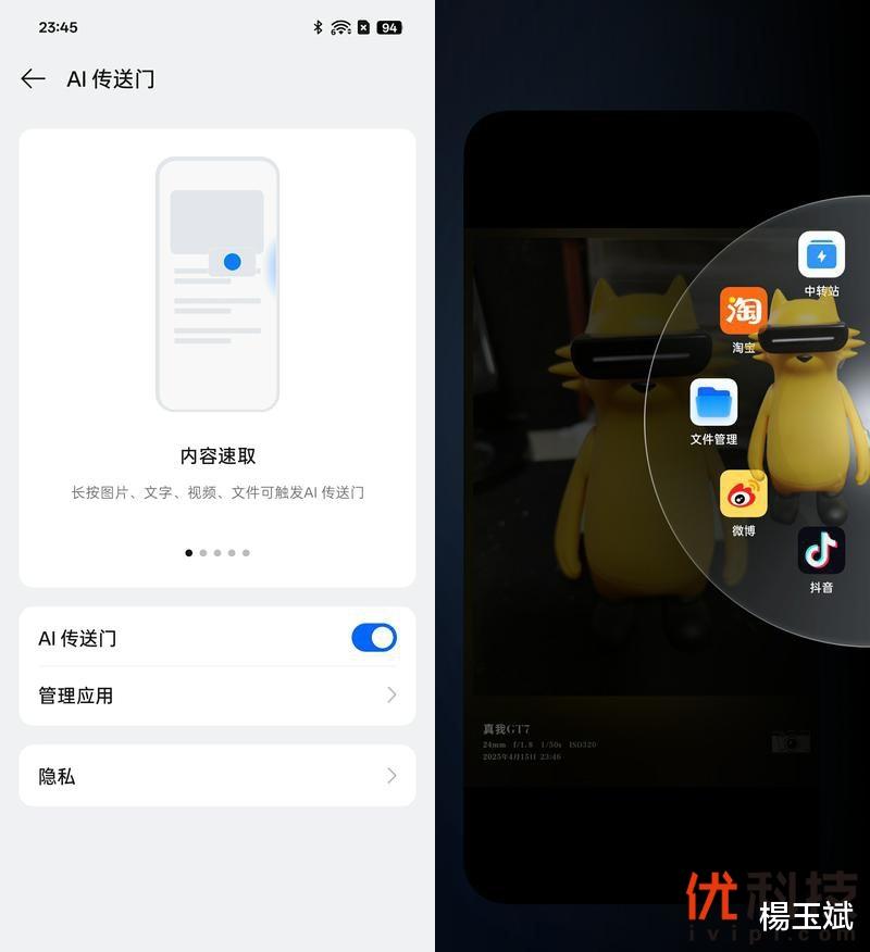 系统内还搭载了非常好用的AI传送门,一键直达,非常好用,仅需两步,一按一拖,更高效的跨应用交互形式,极大地减少了手机的操作步骤。同时交互应用支持自定义选择设定,例如直接发送朋友圈或者微博等等。