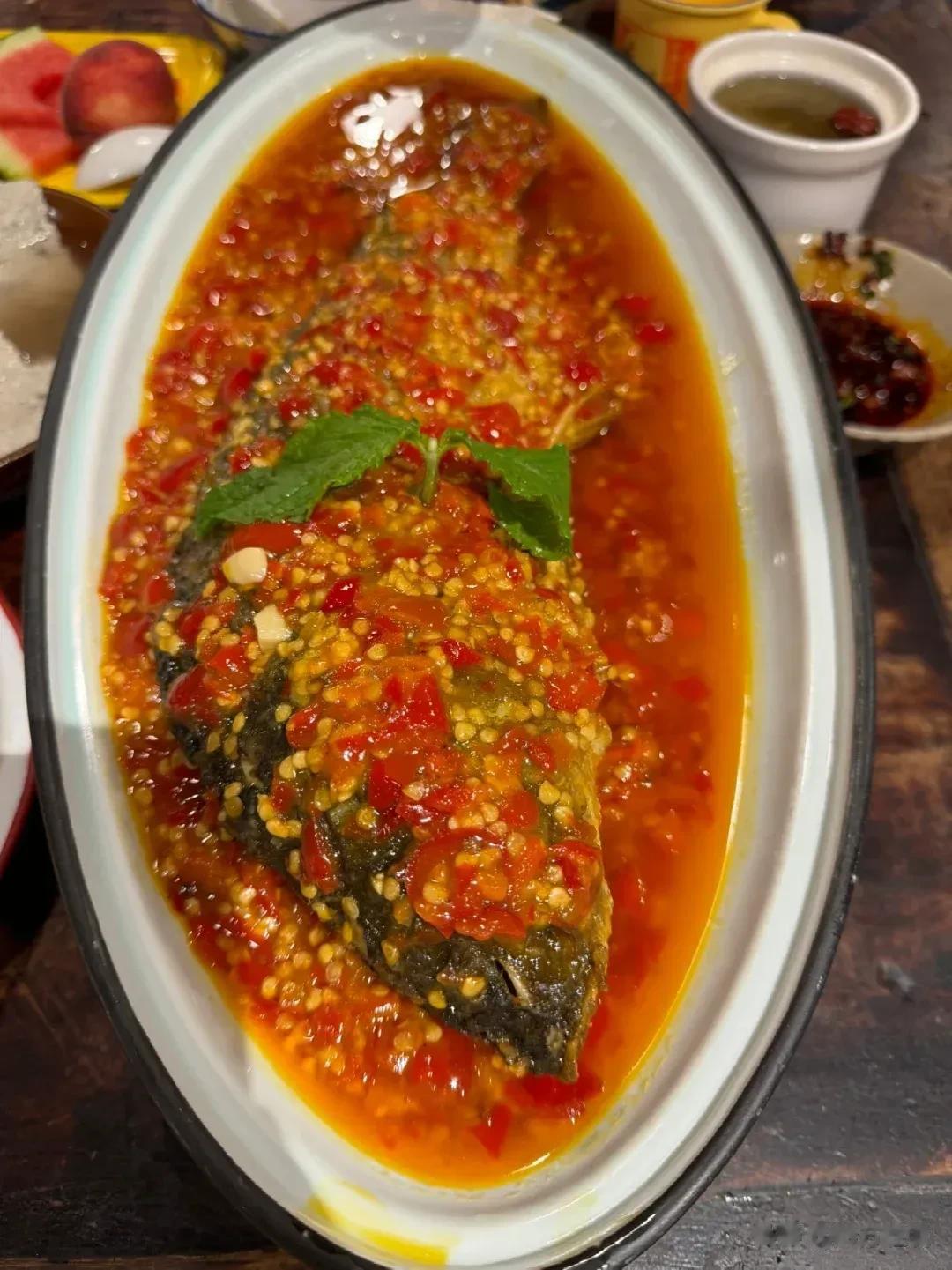 6、糟辣鱼糟辣鱼,是贵州最为常规的烹饪鱼的美食。糟辣鱼的调料基本就是贵州本地家家户户都有的糟辣椒。主要的方法是现将鱼经油炸定型后,然后再将炒制后的糟辣椒、姜蒜等调料放上焖烧入味,成品呈现金红色泽与酸辣鲜香的复合味型,肉质鲜嫩软糯。2010年,被贵州省文化和旅游厅列为黔菜代表性菜肴。