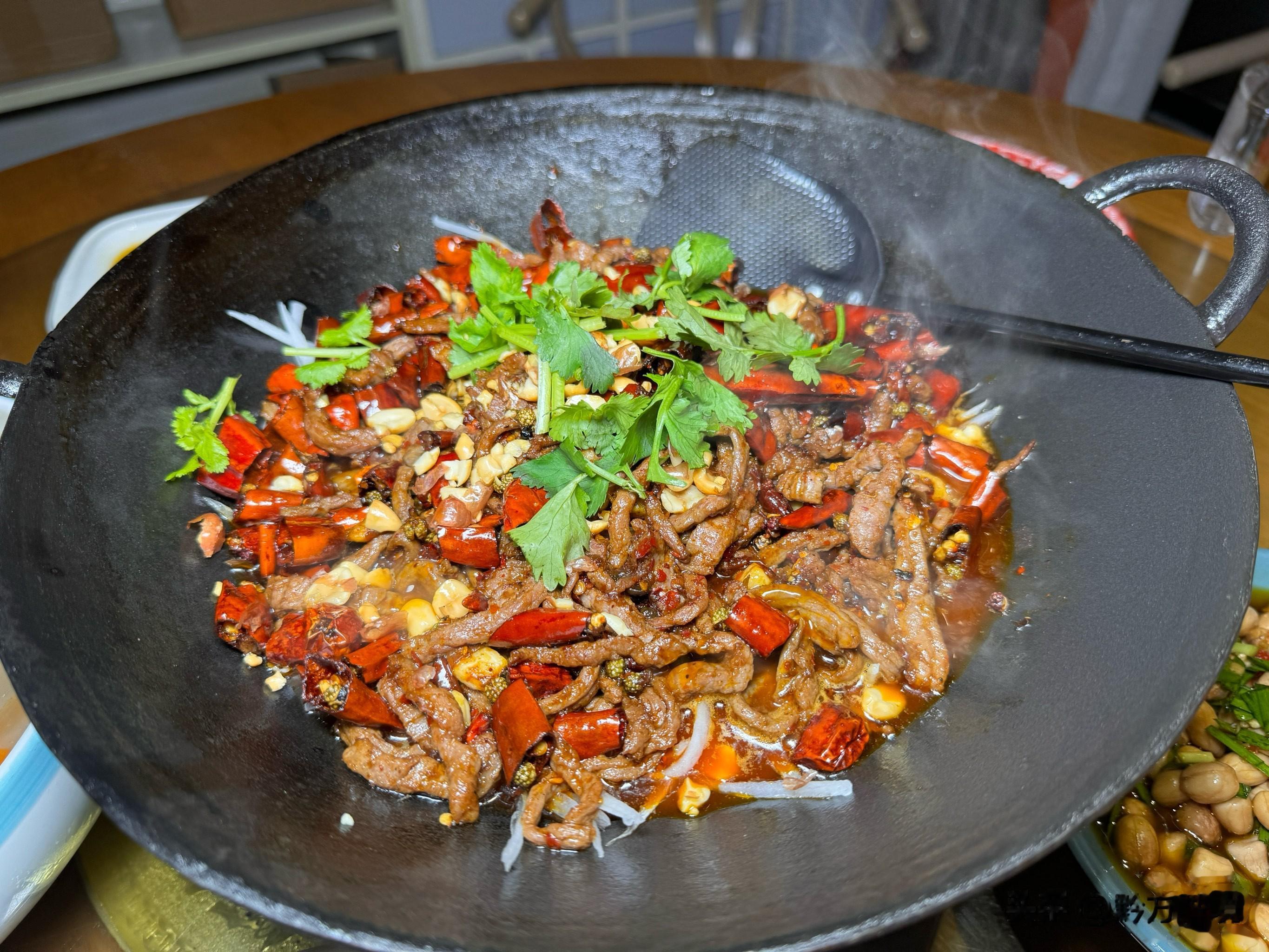 9,干锅牛肉古代中原地区不能随意杀牛,导致牛肉的烹饪技术长期停滞不前。但贵州苗族地区则没有这个限制,养牛、斗牛、吃牛肉都是重要的文化习俗。因此贵州的牛肉相关的菜肴都十分出色,比如黄焖牛肉、干锅牛肉等。贵州许多地方的牛肉餐馆都非常出名,比如施秉牛肉、盘州牛肉等。和辣子鸡一样,贵州的干锅牛肉和川菜的不同,川菜的以豆瓣酱、剁椒等为调料,而贵州则以糟辣椒为调料。