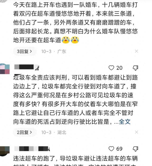 还有网友谴责婚车车队不遵守规则,表示见过很多接亲的车队都是牛逼哄哄的,打开双闪慢悠悠一路排开,觉得挺招人讨厌的,别人想超车就只能违规,结果导致悲剧的发生。