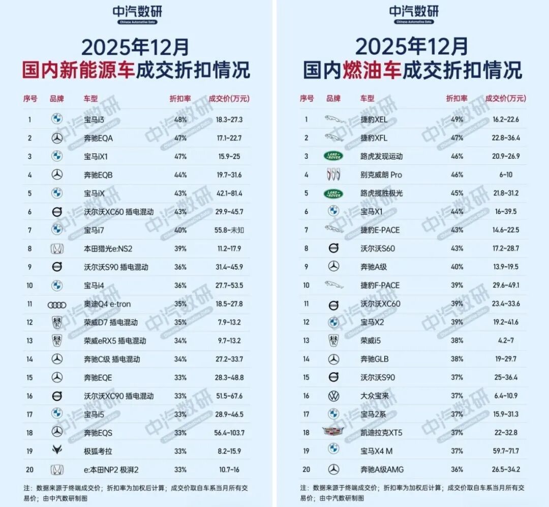 2025年12月车市收官战,“以价换量”依旧是主旋律,新能源汽车和燃油车的终端折扣力度都相当“炸裂”。从媒体统计的TOP20折扣榜单来看,新能源汽车中的豪华品牌几乎包揽前7名,其中宝马i3以48%的折扣率登顶,成交价18.3-27.3万元;奔驰EQA、宝马iX1的折扣率均达47%,成交价下探至15万级;即便是百万级的宝马i7,成交价最低55.8万元就能拿下。自主及合资品牌中,本田猎光e:NS2(39%)、荣威D7插混(35%)也加入降价队列,但折扣力度远不及豪华品牌。