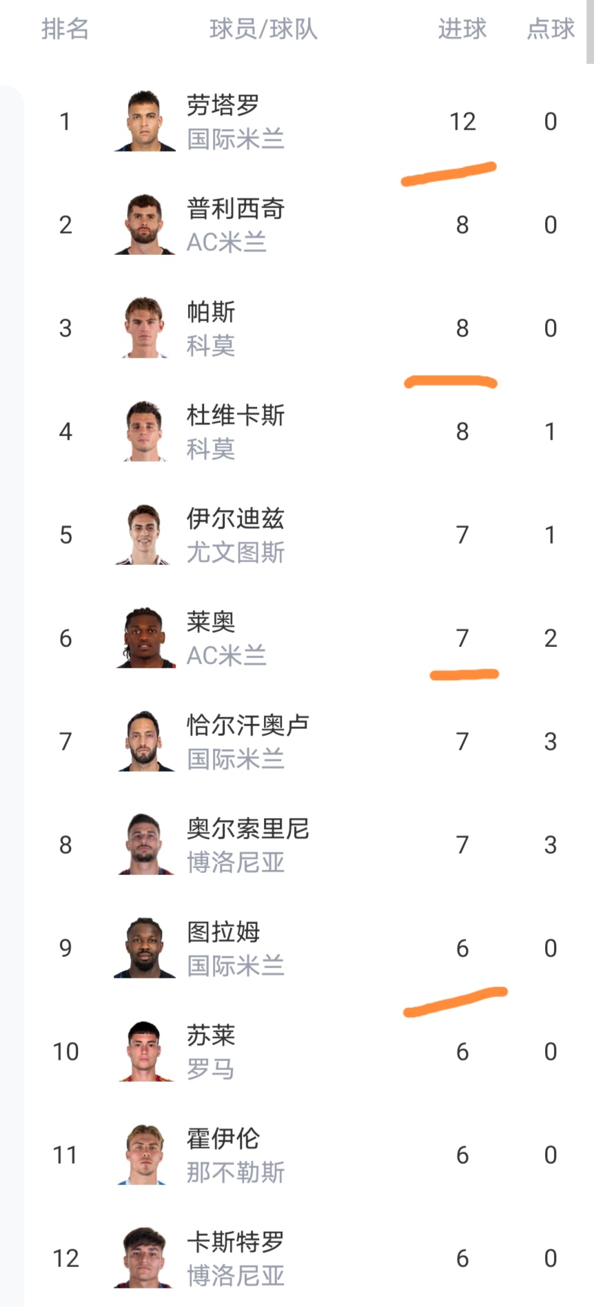 射手榜依然只有一人进球上双,射手榜前12中很多大家熟悉的球星。