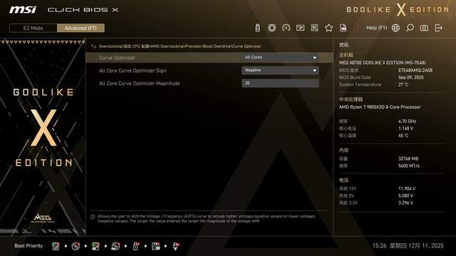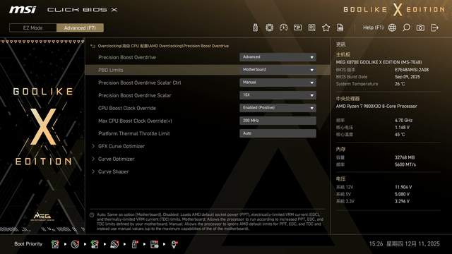 CPU采用手动PBO设置,释放9800X3D性能,同时也为水冷测试提供高压环境。有需要的朋友可以直接抄作业。