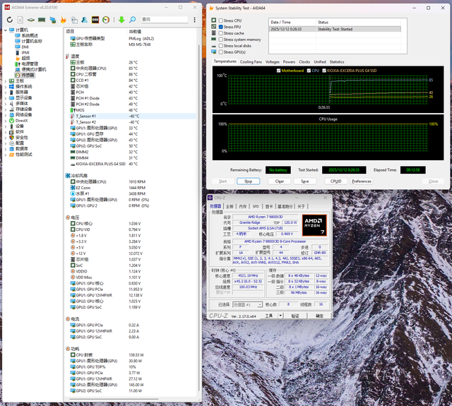 FPU烤鸡十二分钟,9800X3D电压为0.969V,功耗139.5W,温度控制在85℃,联力隐流二代CL版360水冷散热能力出色,烤鸡的时候运行噪声也控制相当良好。
