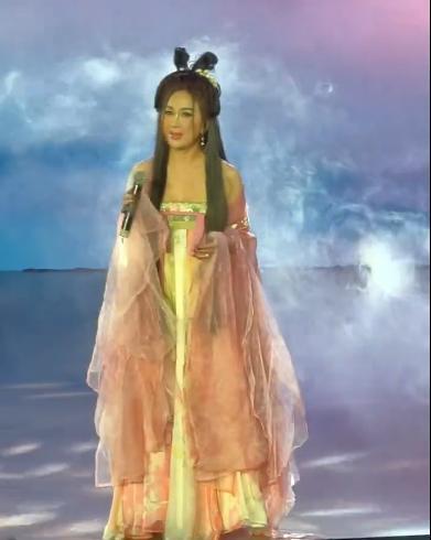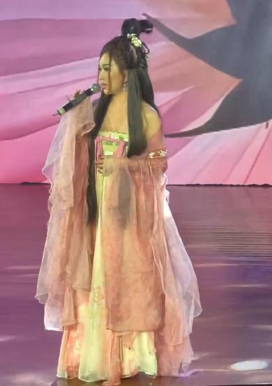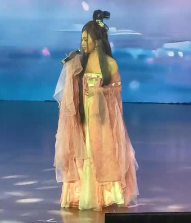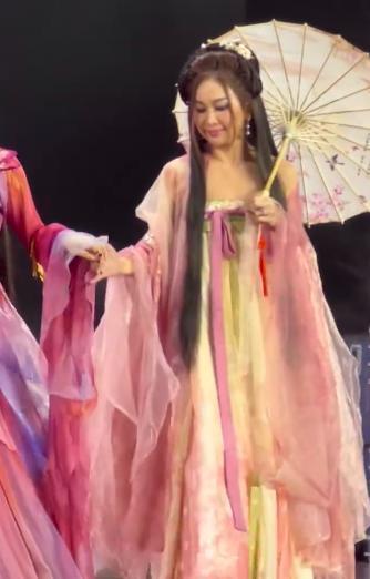 当天她穿的那套黄粉色古风裙装,真是让人不知道该从哪儿吐槽起。