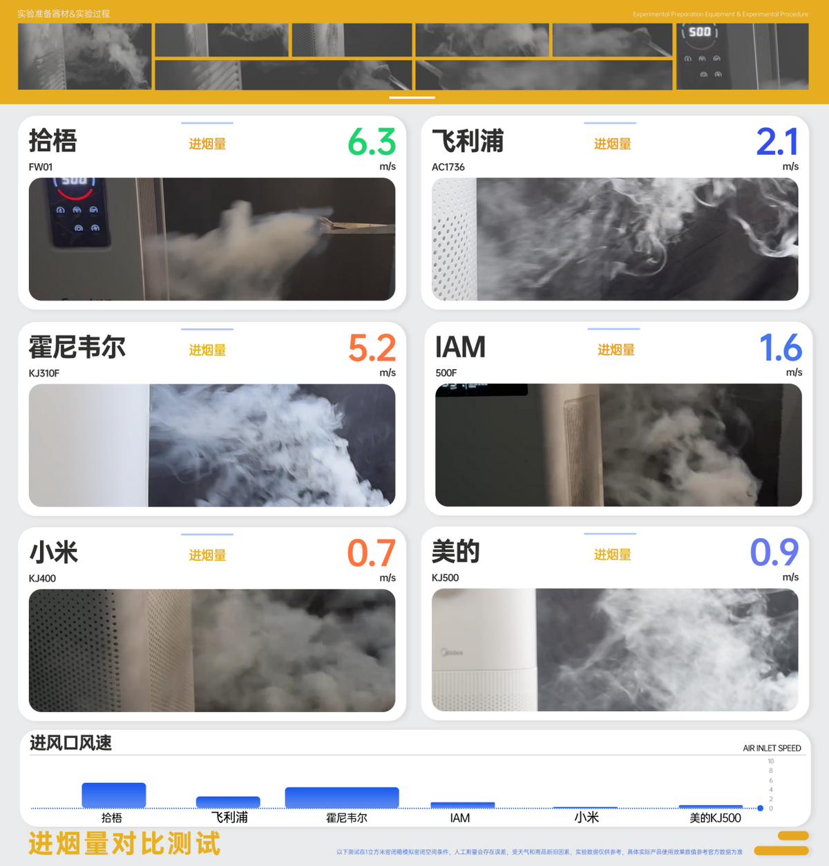 进烟量测试关注的是空气净化器对污染物的主动吸入能力,尤其在应对烟雾这类轻质、扩散快的污染物时,进风速度越快,越能在烟雾上升扩散前实现就近拦截,从而提升净化效率。本项测试中,我们通过烟雾释放后的吸入速度进行对比,体现各机型风道和电机设计的实际表现。