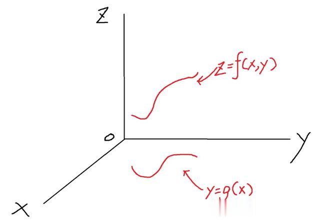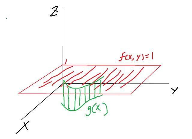 如果没给出x跟y之间的函数关系g(x),那么原本f(x,y)就是一块浮在xoy平面之上的一块布,就如同前面第一张图那样。