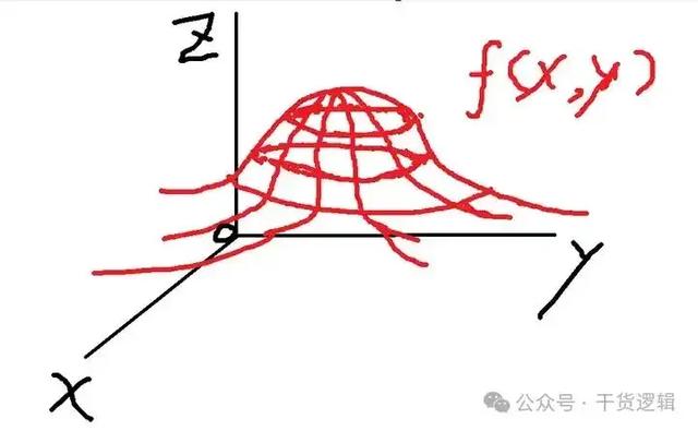 不同的x,y值,对应不同的z值,形成的一个凹凸不平的面,就是二元函数f(x,y)的图像。