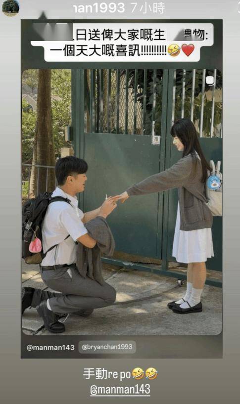 今日23日,儿子陈耀淙宣布向女友求婚成功,他分享出一张与女友身穿校服的照片,陈耀淙手持戒指,单膝下跪向女友求婚,场面浪漫。