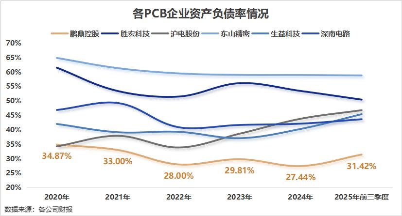 与胜宏科技、东山精密等同行相比,鹏鼎的资产负债率长期处于行业较低水平。截至2025年三季度末,公司的资产负债率为31.42%。