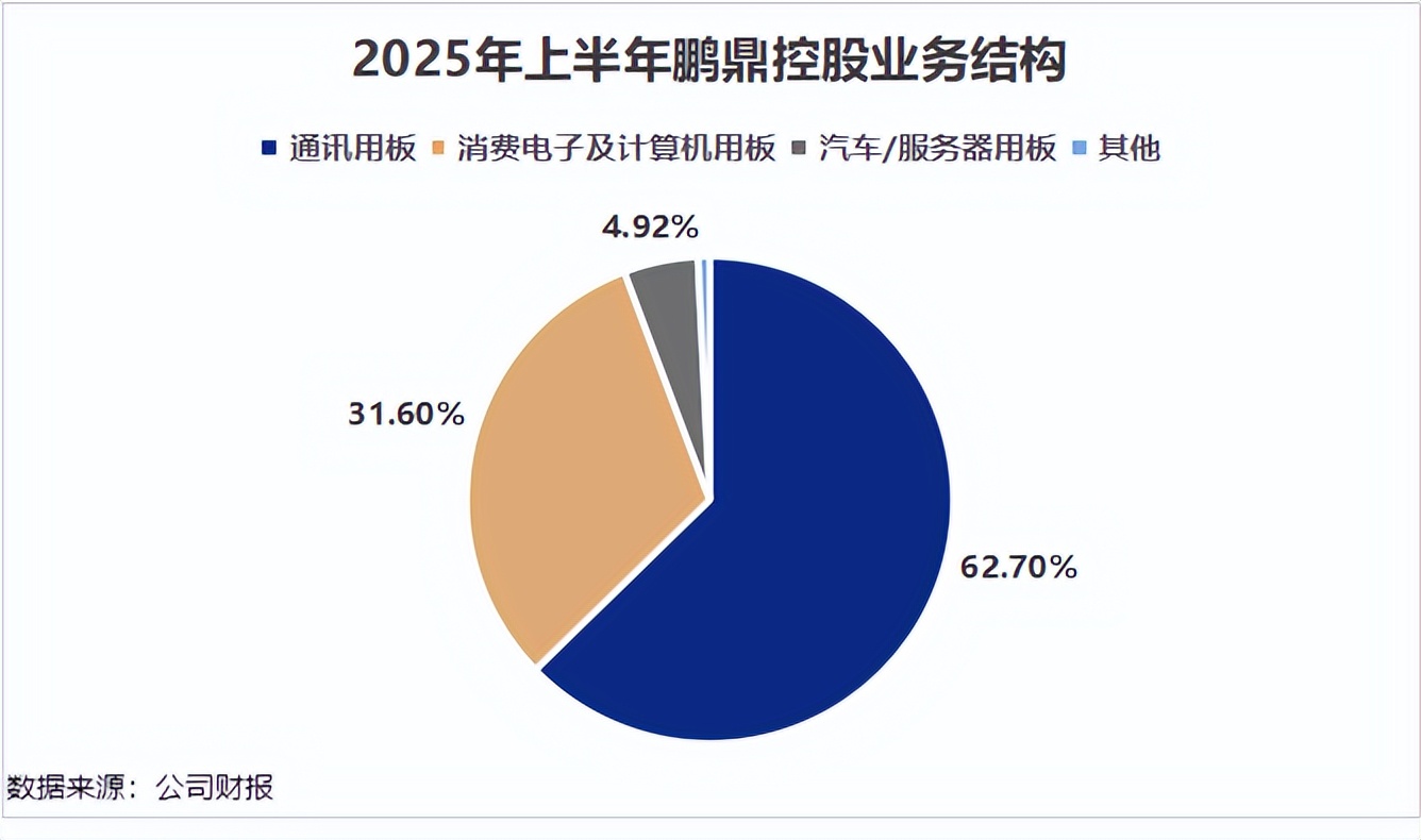 2025年上半年,鹏鼎控股的营收结构中,通讯用板和消费电子用板占据了90%以上的收入,是公司收入的绝对主力。