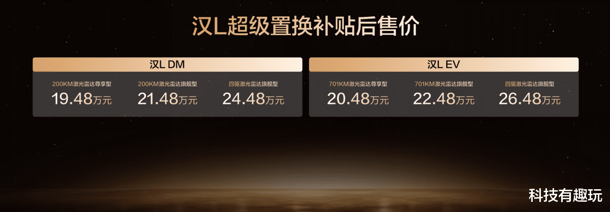 此次,汉L EV 3款车型,超级置换补贴后售价20.48万~26.48万元;汉L DM 3款车型,超级置换补贴后售价19.48万~24.48万元;唐L EV 3款车型,超级置换补贴后售价22.48万~27.48万元;唐L DM 3款车型,超级置换补贴后售价21.48万~27.08万元。同时,比亚迪还为用户准备了包含置换补贴在内的至高价值5.2万元(汉L)/4.5万元(唐L)尊享礼遇。(以上权益截至12月31日)