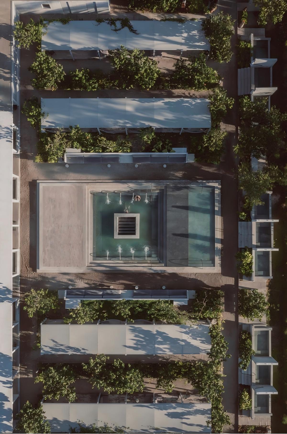 花园温泉的中心是那座容纳着泉眼的大型温泉池。其几何形态被构思为倒置的金字塔,以向下的同心层级邀请身体缓慢接近水面。周围开放平台提供休憩、聚集或沉思的空间。其平坦而宽裕的表面使中心空间延伸至水体之外,成为可适应多种存在方式的公共场所。