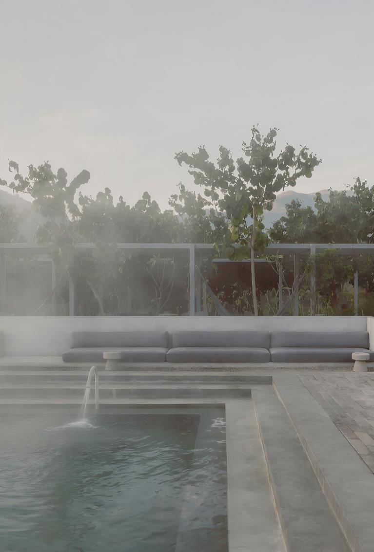 亿伽设计和您一起赏析花园温泉设计,它位于温泉综合体之中,被构想为一场围绕身体、水与静默展开的体验序列。它超越了功能性的范畴,更像是一种缓慢而审慎的仪式,引导人们以更温柔的方式与物质与时间建立联系。