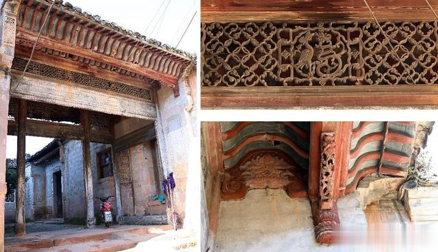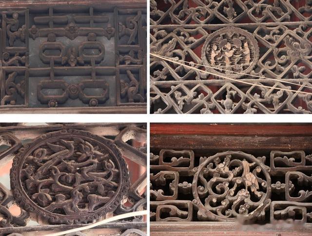 门厅头顶漏窗装饰有“寿”字、古钱纹木雕,寓意多钱多寿。更是有神仙故事人物、龙凤、麒麟、象首、朱雀、双喜、福字、宝瓶、南瓜、蝙蝠、莲花、卷草纹、古铜钱等多种祥瑞题材相间房屋各个角落,题材丰富,寓意深远;其中以“龙凤呈祥”木雕,尤为构思独特、雕琢巧妙,动态优美。