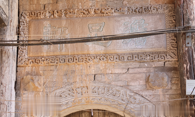 石拱门门楣悬挂石匾为一幅展开的书卷,寓意开卷有益;书卷上题“芸晖”二字,暗喻书房;其门头为古代铜钱串联的拱形造型,有富贵、富有之寓意;原门楣上悬挂的是“双狮”圆雕,寓意“双狮拱门”。