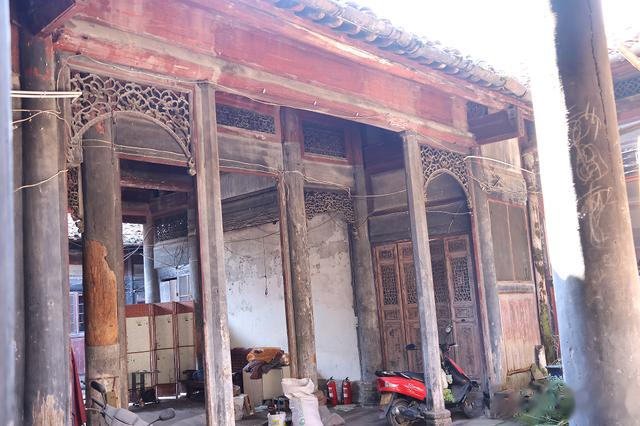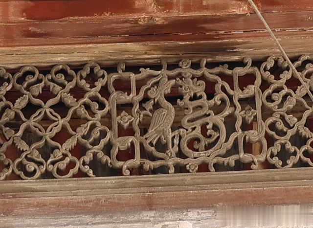 中门,门廊式大门,弓棚顶装饰精美,月梁雕刻有蝙蝠向下飞,寓意福从天降;垂花柱圆雕有栩栩如生的“迎覆莲花”造型,雀替为卷草、鳌鱼圆雕。最为精美的是漏窗,中央是龙凤形组成的“福”字,凤凰高傲的抬着头颅与昂头向上的草龙对视,形态尤为灵动。