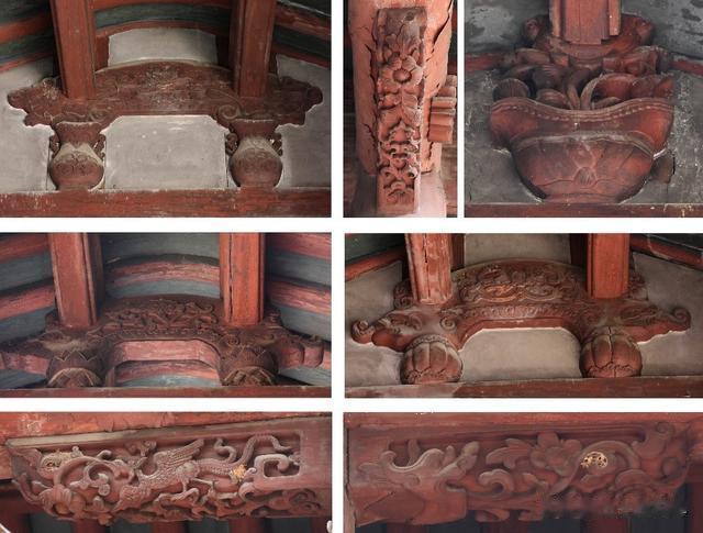 院门后面是柱廊,其弓棚顶、檐下卷棚构筑十分华丽,月梁表面雕刻象首、寿桃、双凤凰、花篮等精美浮雕图案。柱廊下十个石柱础雕刻有丰富的图案。