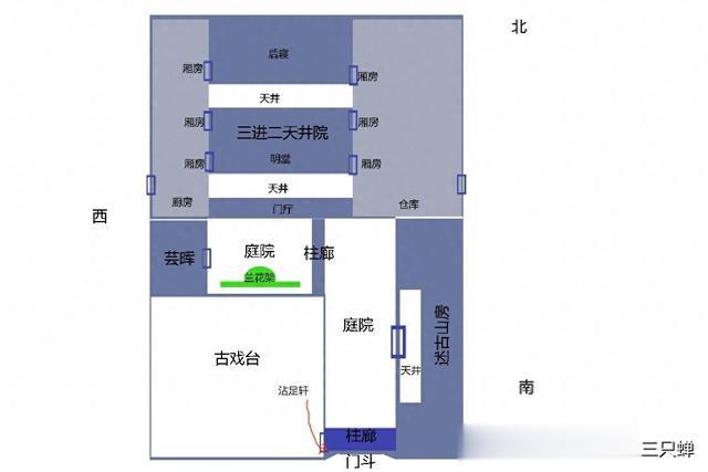 大宅,由私家花园、古戏台、私塾学堂、仓库、书屋、院门、中门、三进天井院等建筑组成,占地约2000多平米。