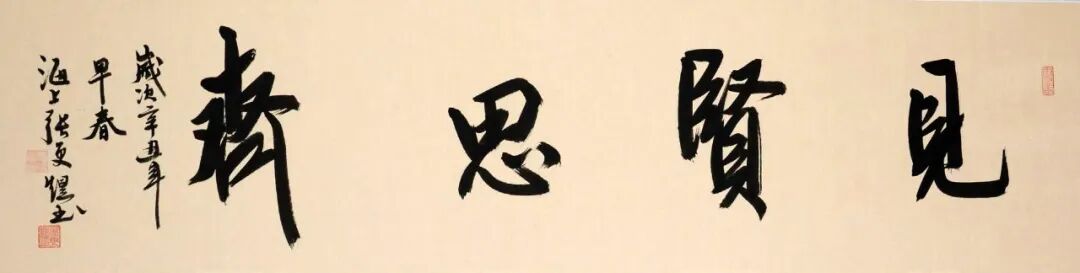 张更煜先生的书法,堪称是博涉多广,行书、篆书、楷书、隶书在他笔下皆是写得入古而出新。而在这些作品中,我则尤为倾心于张更煜先生的行书,通幅挥毫,真可谓是将魏晋风骨与书卷气概尽显无遗!常言文以学养积厚为贵,书以载道品节为先,张更煜能将行书写得如此妙哉,当然也是与他多年来饱读诗书的积累离不开关系,临池问道,精研笔墨;探赜书论,心与古会。经此久而久之,才逐渐涵养出了那股如兰似蕙、清气盎然的文人书风。