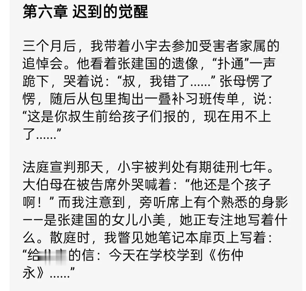 夕阳的余晖,把我们的影子拉得老长,就像两株在风雨中挣扎的小树。我心里明白,这场救赎之路,才刚刚迈出第一步。而那些在溺爱中扭曲的灵魂,或许要用一辈子的时间才能明白:生命不是游乐场里的碰碰车,没有能让你重来一次的按钮。