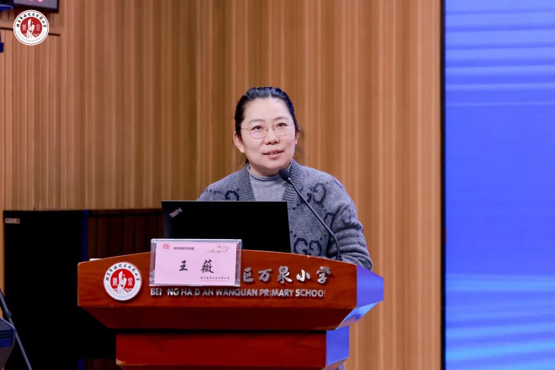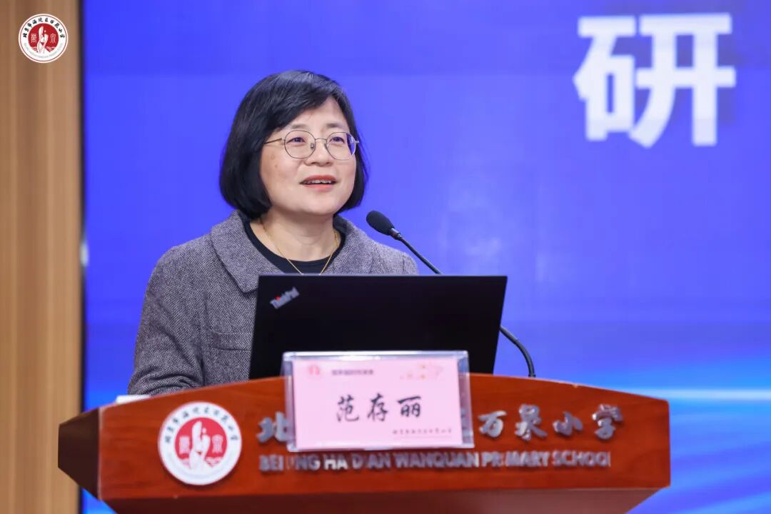 教研副校长管立从“行研培”一体教师发展体系出发,说明学校构建了行动、研究、培训深度融合的教师发展体系,已形成螺旋上升的成长生态。万泉小学通过全员实训、学科培训、分层培训三类模式精准支持教师梯队发展,并借助“团组导链式”教研与“高位引领式”科研,推动教学真问题转化为可推广成果,使每位教师成为素养教育的能动实践者与革新力量。