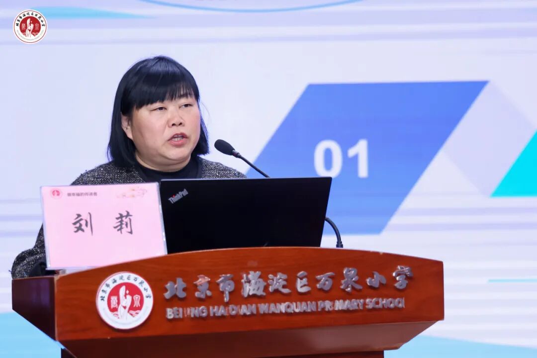 随后,万泉小学教育集团金毅校长带领刘莉、管立、于海萍三位副校长从多维度进行了《素养导向下育人新生态的建构与实践》主题汇报。校长金毅以“泉之育”课程为主题,介绍了学校以“泉”为文化内核,构建“源泉-汇泉-涌泉”三级递进的绿色生态课程体系,形成“幸福泉娃”育人目标体系。