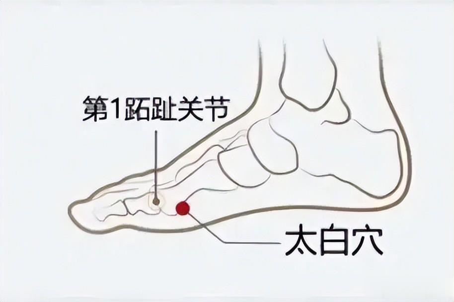 ②太白穴,位于足内侧第1跖骨小头后下方赤白肉际凹陷处,足太阴脾经的输穴及原穴,出自《灵枢·本输》。该穴深层分布有足底内侧神经、血管及拇展肌,现代常用于治疗急慢性胃肠炎、消化不良、神经性呕吐等消化系统疾病。太白穴具有健脾和胃、清热化湿的功效,主治胃痛、腹胀、呕吐、呃逆、泄泻、便秘、肠鸣等脾胃病症,对体重节痛、脚气红肿等肢体症状亦有疗效。