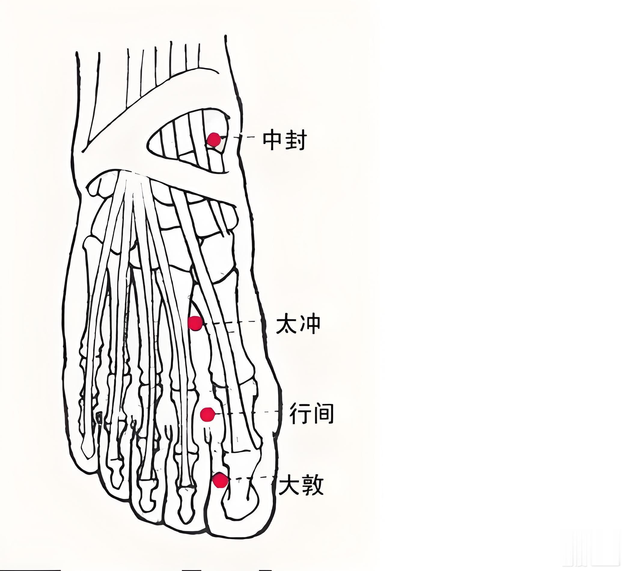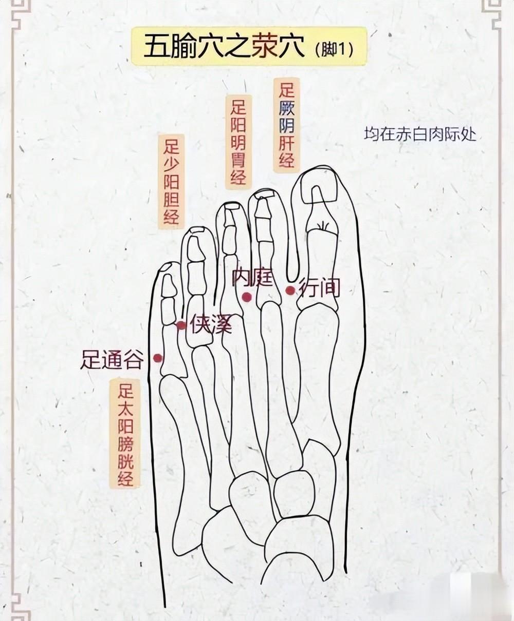 行间穴:足背第1、2趾间,趾蹼缘后方赤白肉际处。足厥阴肝经荥穴,疏肝理气、泻肝火,主治头痛、目眩、失眠等。