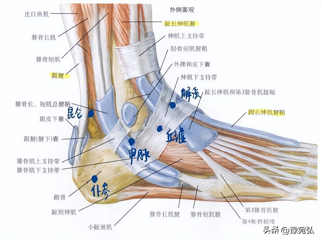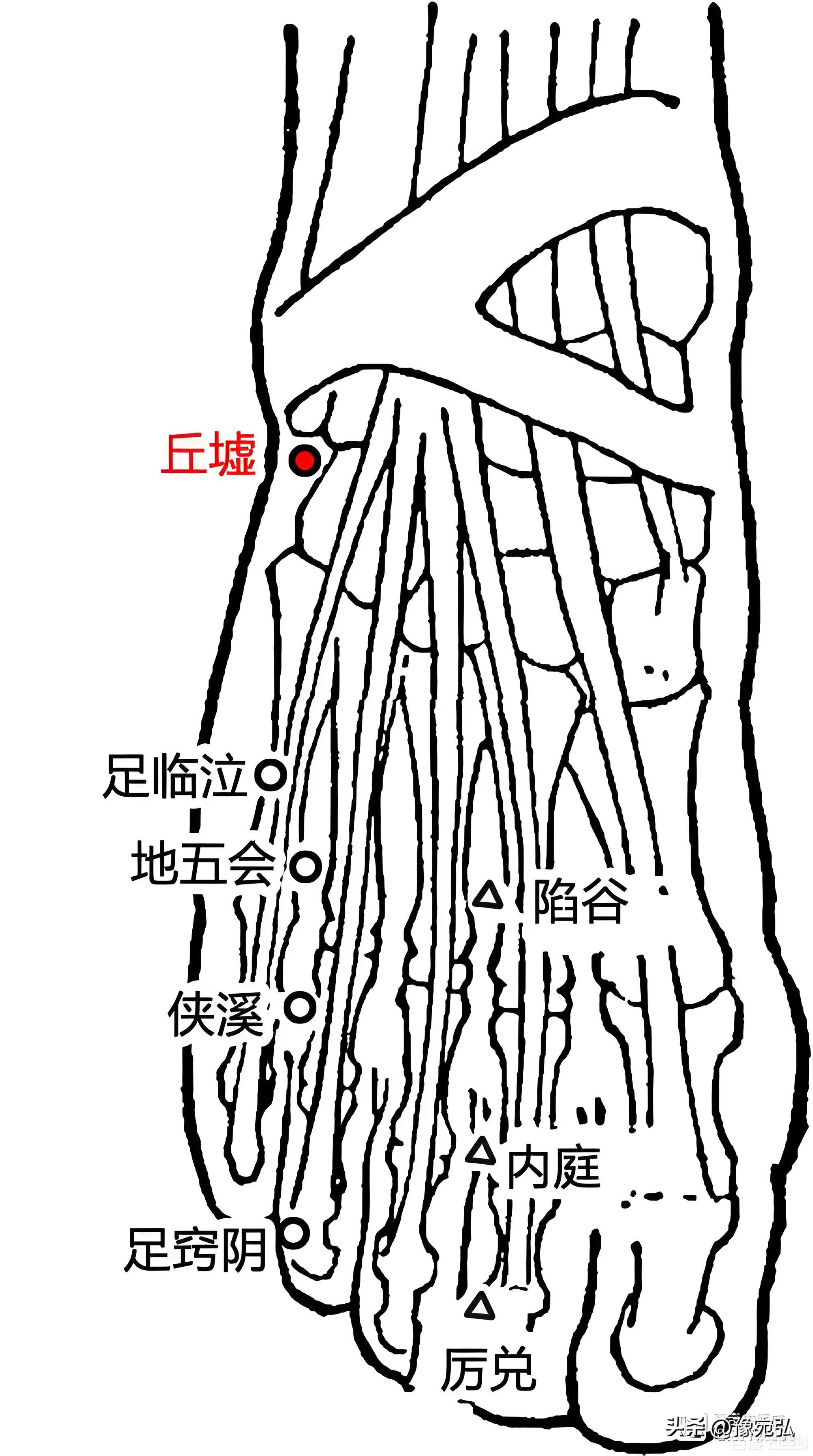 丘墟穴,位于足外踝的前下方,当趾长伸肌腱的外侧凹陷处