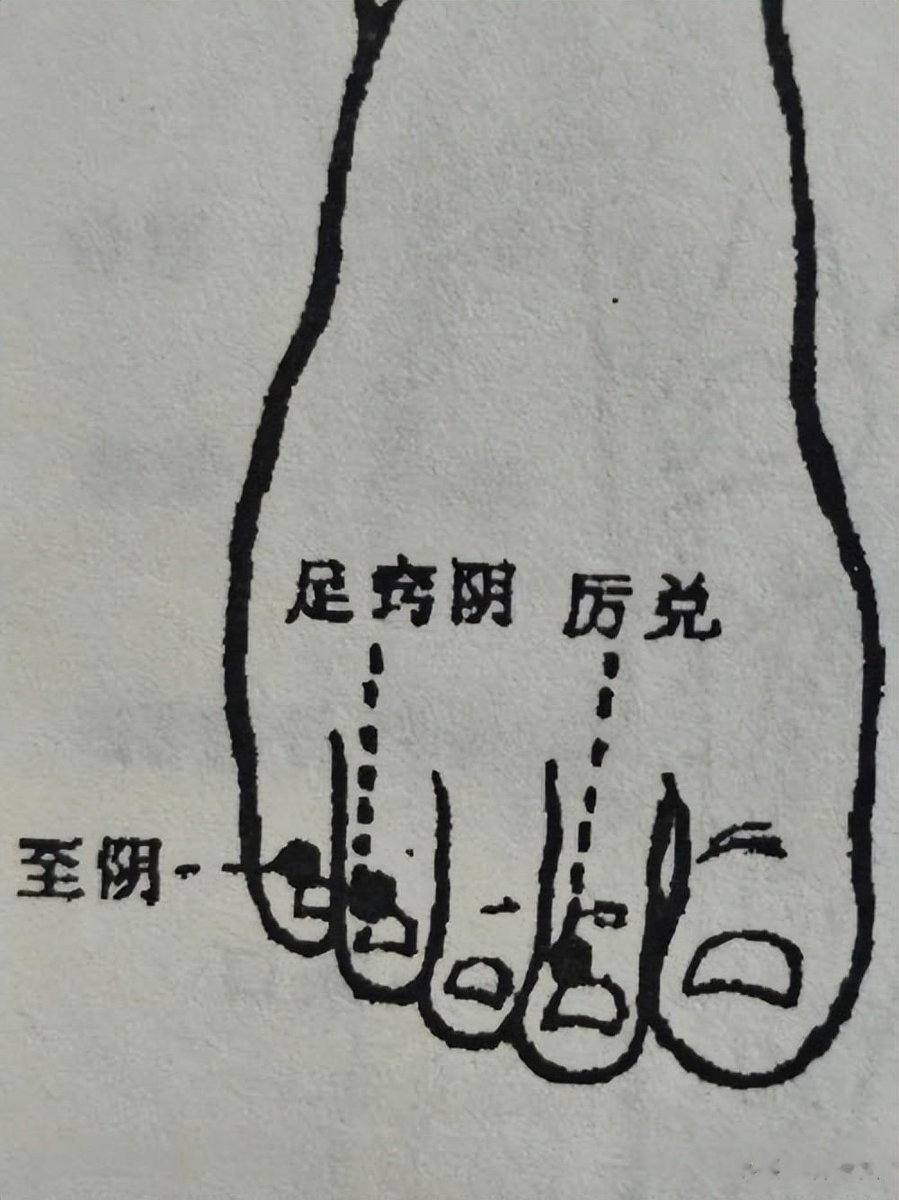 ③厉兑穴(胃),是足阳明胃经的井穴,位于第2趾末节外侧,趾甲根角旁0.1寸(约1-2毫米)的凹陷处。取穴时,可沿第二脚趾外侧边缘推向趾甲根部,按压有酸胀感即为此穴。④足窍阴穴(胆),属足少阳胆经,位于第4趾外侧,距趾甲根角0.1寸,主疏肝、通络。⑤至阴穴(膀),属足太阳膀胱经,位于足小趾外侧趾甲角旁0.1寸处,主散寒、理气。