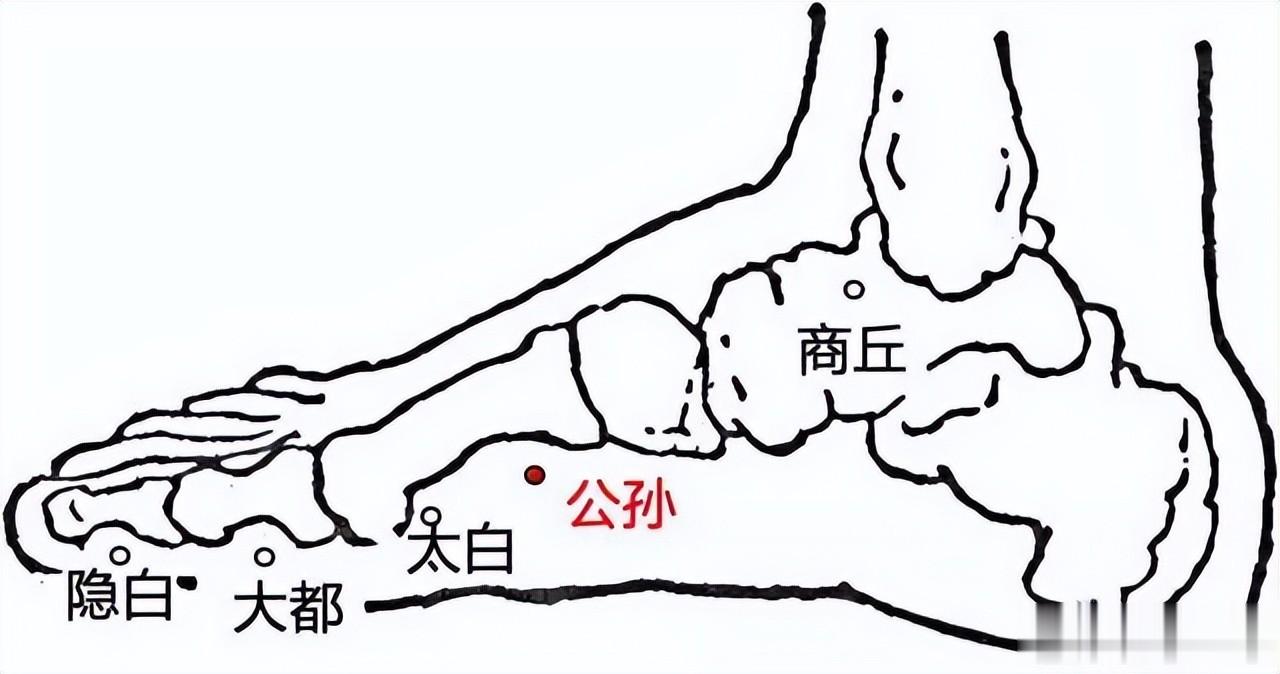 ①公孙穴,在足内侧缘,当第1跖骨底的前下方,赤白肉际处。足太阴之络穴,八脉交会穴之一,通冲脉。布有隐神经及腓浅神经分支,足背静脉网及跗内侧动脉。主治胃痛,呕吐,肠鸣,腹痛,泄泻,痢疾,腹胀,食不化,脚气等。直刺0.6—1.2寸。