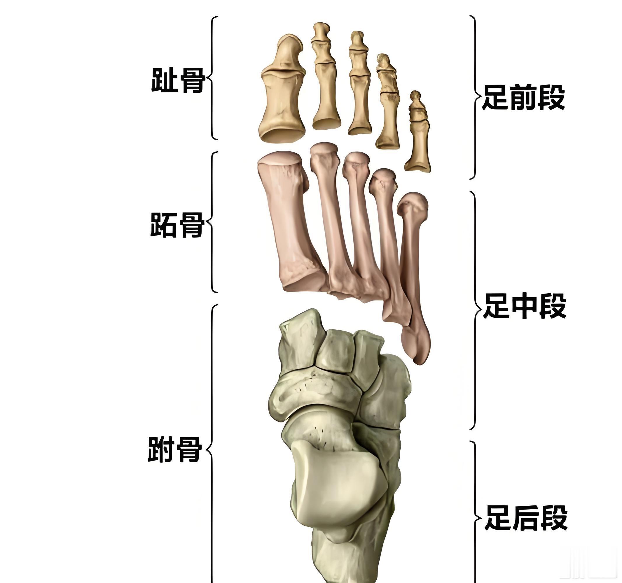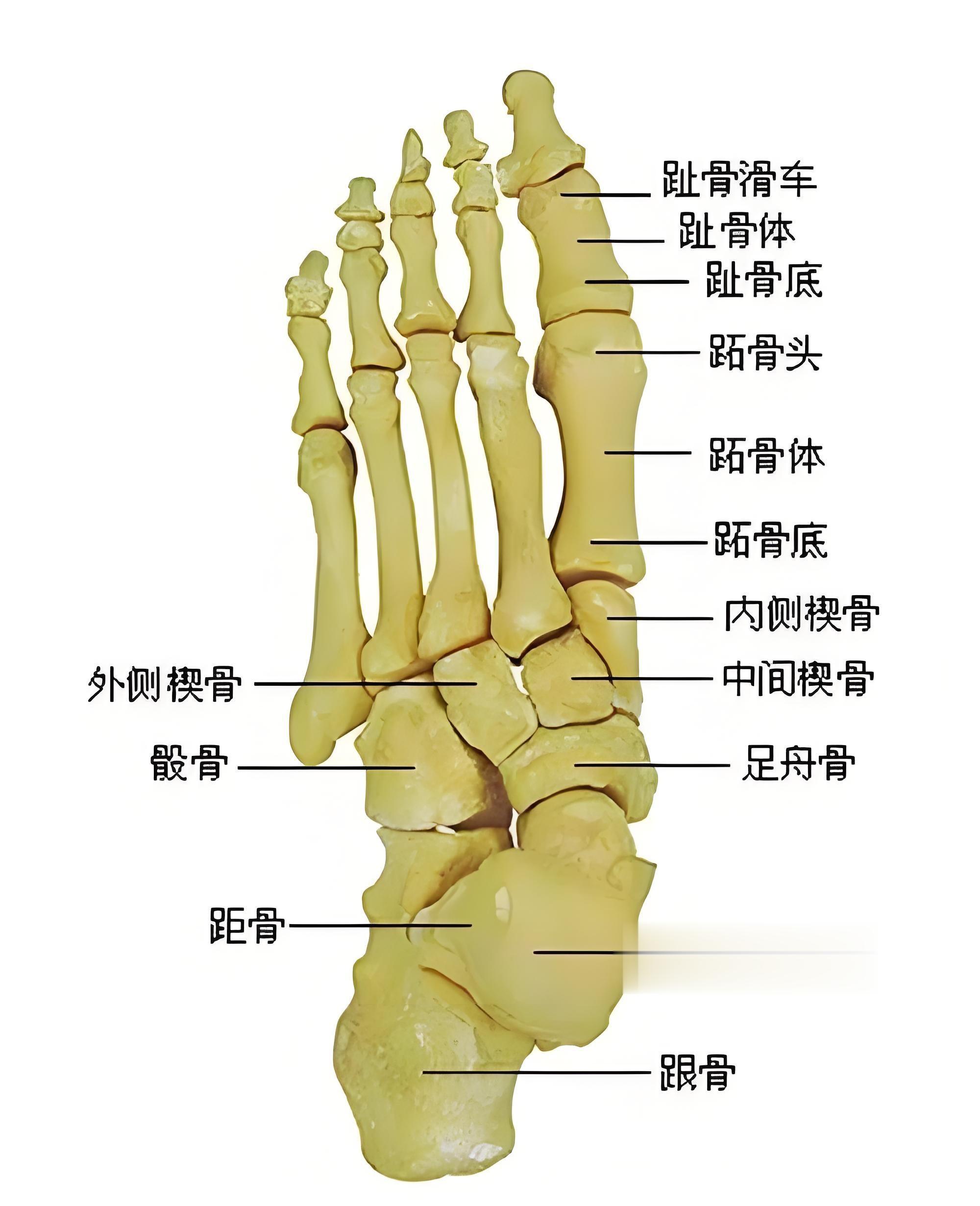 跖趾关节,是由跖骨头与近节趾骨底构成的椭圆关节,跖趾关节属椭圆关节,能绕冠状轴做屈(勾足趾)、伸(伸足趾),绕矢状轴做轻微的外展(五趾骨展开)、内收(五趾骨并拢)运动,其中第一跖骨头和第四、五跖骨头成为内、外侧纵弓的前端承重点,为维持运动足底着地支撑,特别是起蹬的稳定性起到一定作用。跖趾关节背屈可达90°,跖屈由于韧带和肌腱的限制,第1跖趾关节跖屈约30°,其他4趾可达50°。