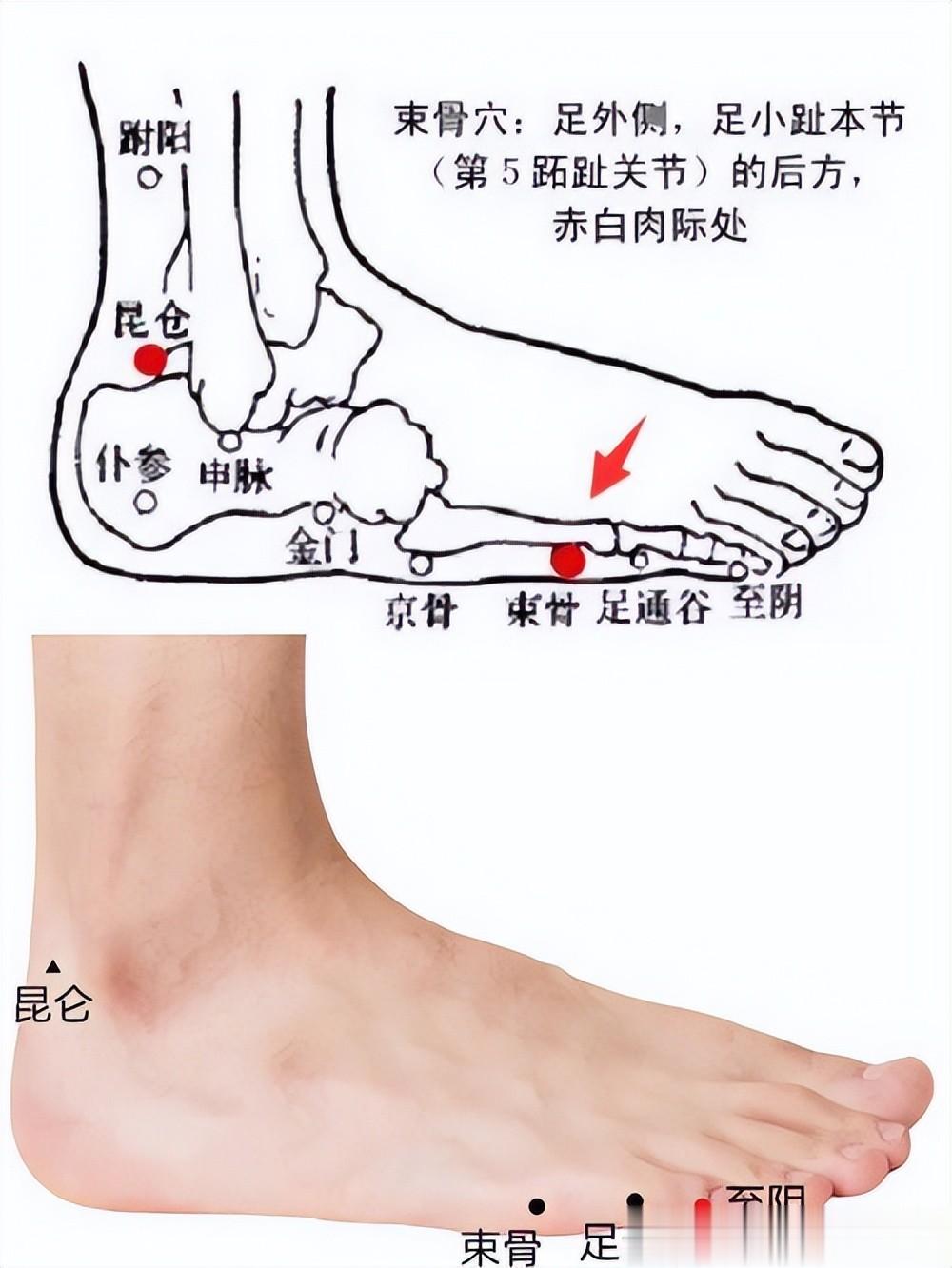 ③束骨穴,位于第5跖趾关节后方,赤白肉际处,在小趾外展肌下方;是足太阳膀胱经的常用腧穴之一,有第4跖趾侧总动、静脉;有第4跖趾侧神经及背外侧皮神经分布。主治头痛、项痛、目眩等头部疾患;腰腿痛;癫狂。