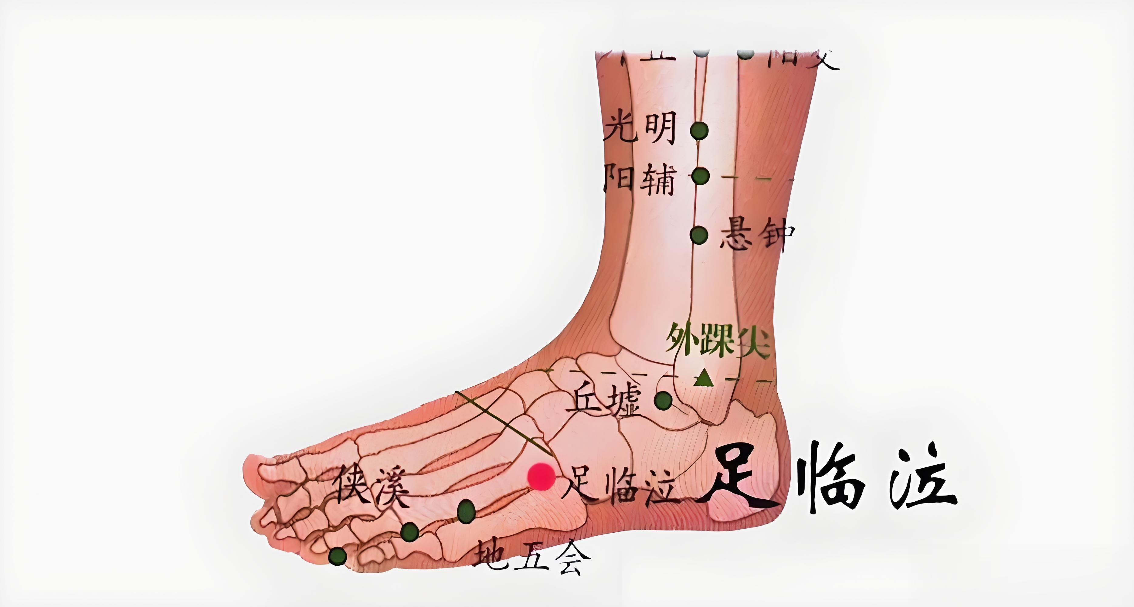 ③足临泣,位于足背外侧,第4、5跖骨底结合部,前方凹陷处。该穴具有疏肝利胆、通络止痛、清头明目的作用,常用于缓解头痛、目赤、胁痛、足背肿痛等症状。足临泣为胆经输穴,属木,属八脉交会穴通带脉穴。