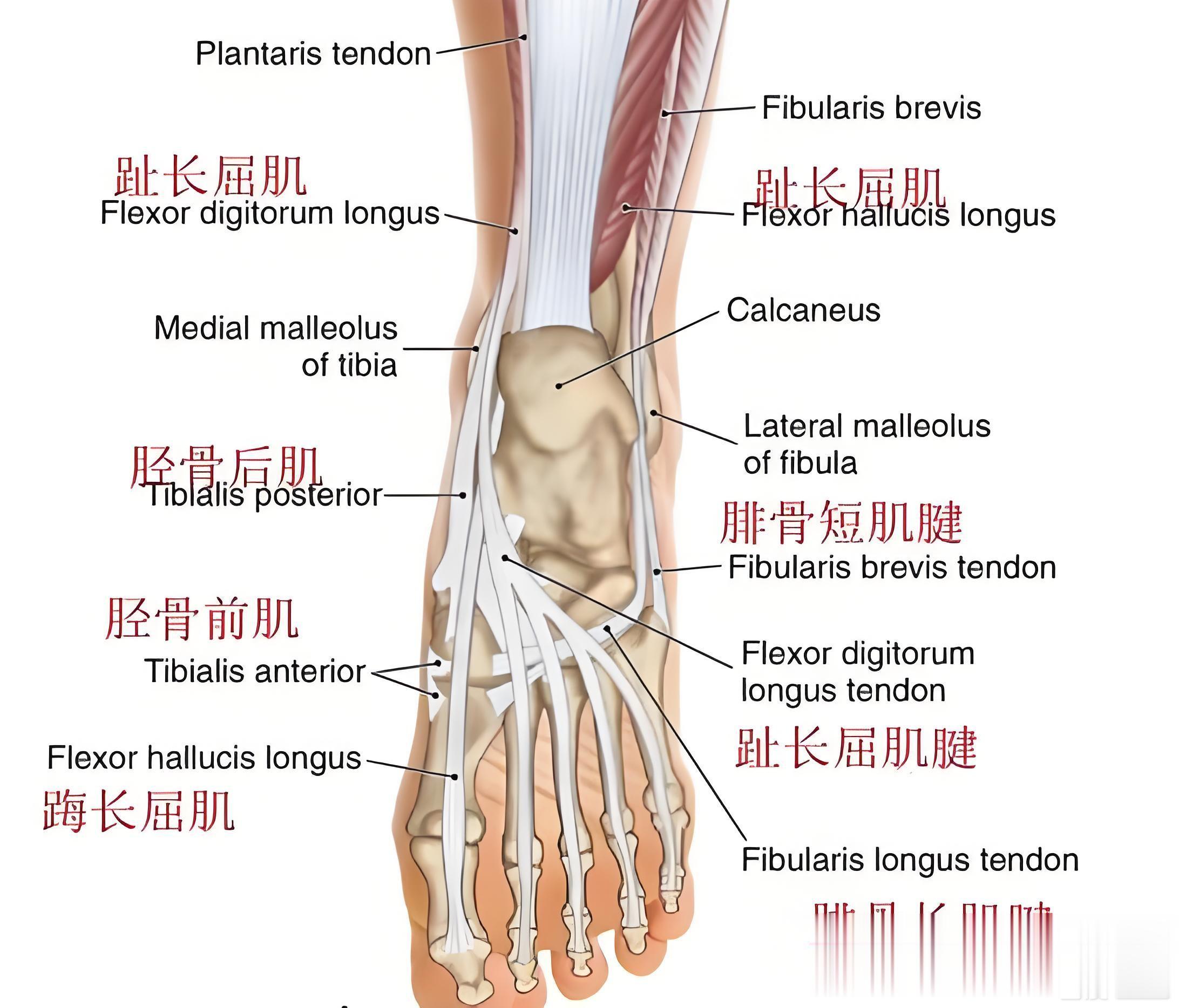 长屈肌腱与趾长屈肌腱,长屈肌腱,起自腓骨后面下2/3,经内踝后方至足底,止于踇趾远节趾骨底。趾长屈肌腱起自胫骨后面中1/3,经内踝后方至足底,分4条肌腱止于第2-5趾远节趾骨底。