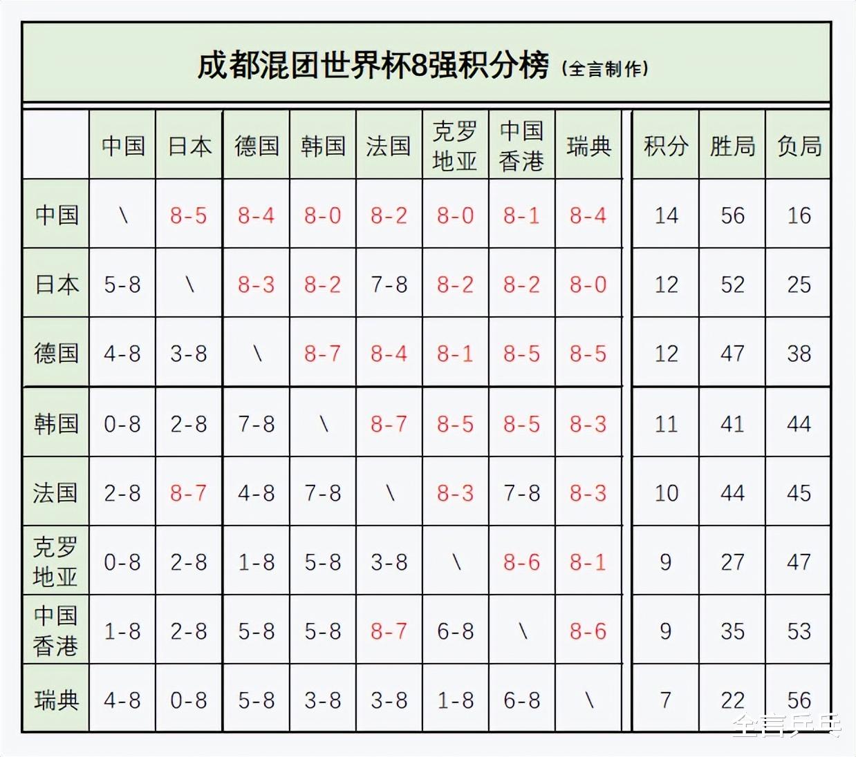 德国:7胜(第一阶段8-4法国、8-5罗马尼亚、8-2巴西,第二阶段8-5瑞典、8-1克罗地亚、8-4法国、8-7韩国、8-5中国香港)2负(4-8中国、3-8日本);