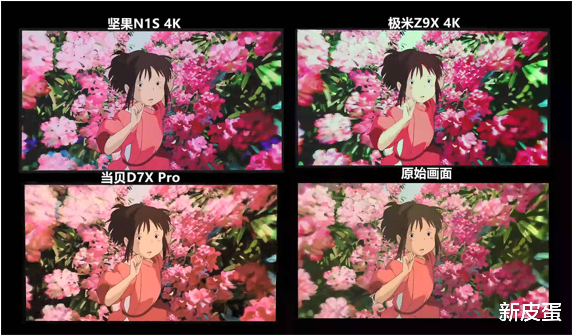 《千与千寻》(动画风格):花丛场景的品红与洋红还原中,主观排名为当贝D7X Pro>极米Z9X>坚果N1S;大面积屋顶场景中,当贝D7X Pro色彩最贴近原片。