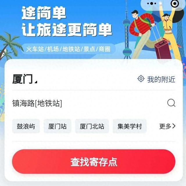 部分寄存点 ✅镇海路站/中华城/中山路·寄存点 ⏰10:00~22:00 距镇海路地铁站3A口约100米 - ✅吕厝地铁站·寄存点 ⏰09:30~20:30 距吕厝地铁站5口约50米 - ✅吕厝地铁站·寄存点 ⏰09:00~23:59 距吕厝地铁站6口约20米 - ✅乌石浦站/SM广场·寄存点 ⏰09:00~23:59 距乌石浦地铁站4A口约280米 - ✅集美学村·寄存点 ⏰09:30~22:00 距集美大学航海学院约260米,集美学村约400米 - ✅厦门北站·寄存点 ⏰08:00~23:00 距厦门北站约50米 - 厦门有30多个寄存点,更多寄存点可在【途简单】查看