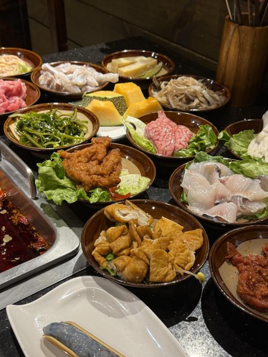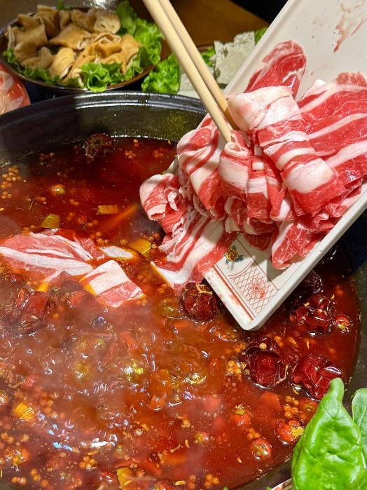 是正宗的重庆火锅锅底,麻辣鲜香越煮越有味,鲜鸭肠脆爽弹牙,贡菜吸满汤汁,辣得特别过瘾。