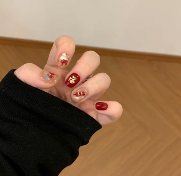 配色方案则紧扣传统新年主题,以正红与璀璨金为主流。红色多作为主色调,选用饱和度较高的朱砂红或酒红色,呈现饱满的视觉效果。金色的运用则较为灵活:可作为细线勾勒轮廓,形成描边效果;亦可化作细碎闪粉或金属颗粒,与红色搭配形成渐变;或以块面形式绘制几何条纹、法式边等,增加设计的层次与华丽感。红金组合既经典喜庆,也易于搭配各类冬季服饰。
