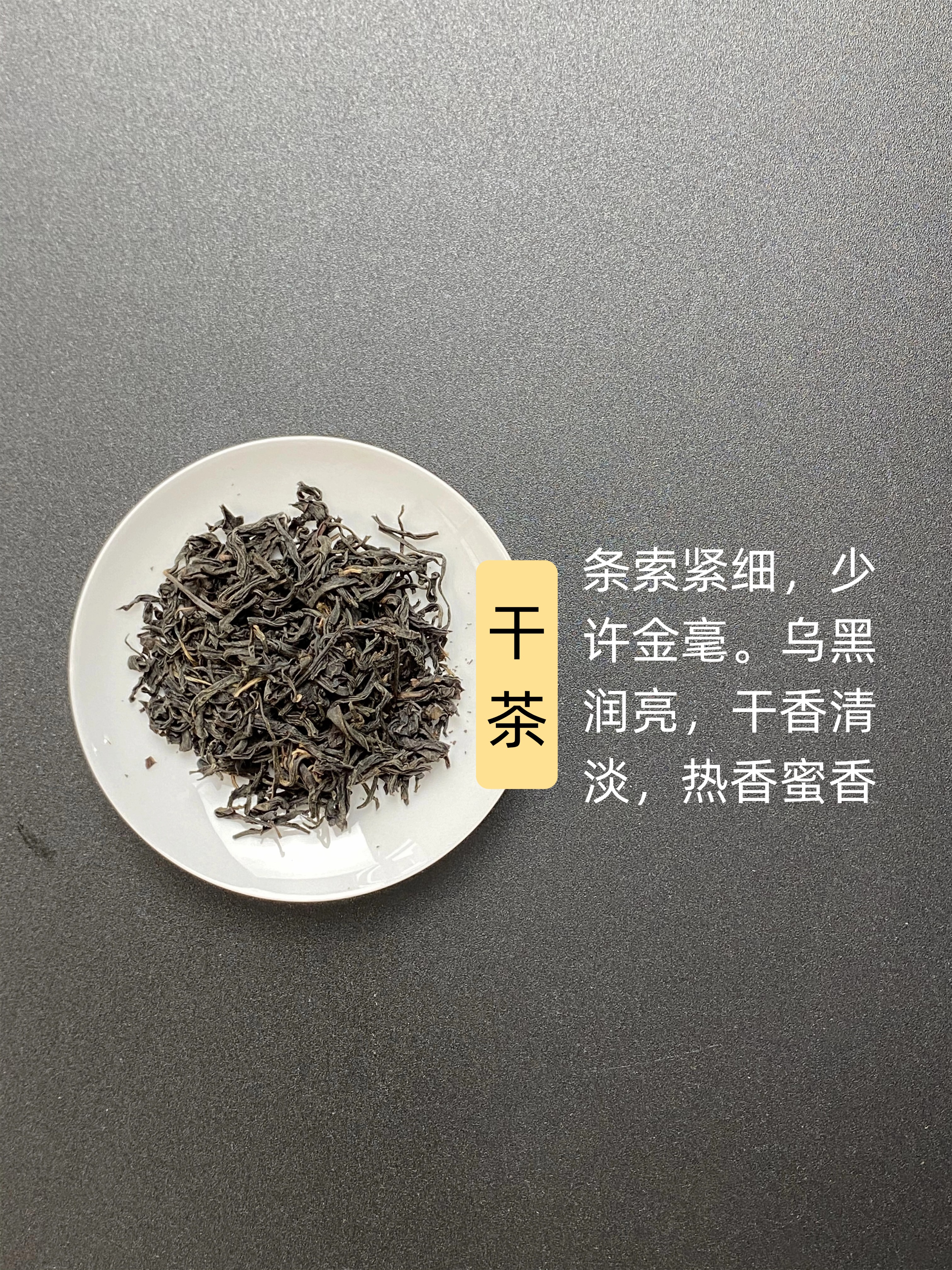 干茶,条索紧细,少许金毫。乌黑润亮,干香清淡,热香蜜香。
